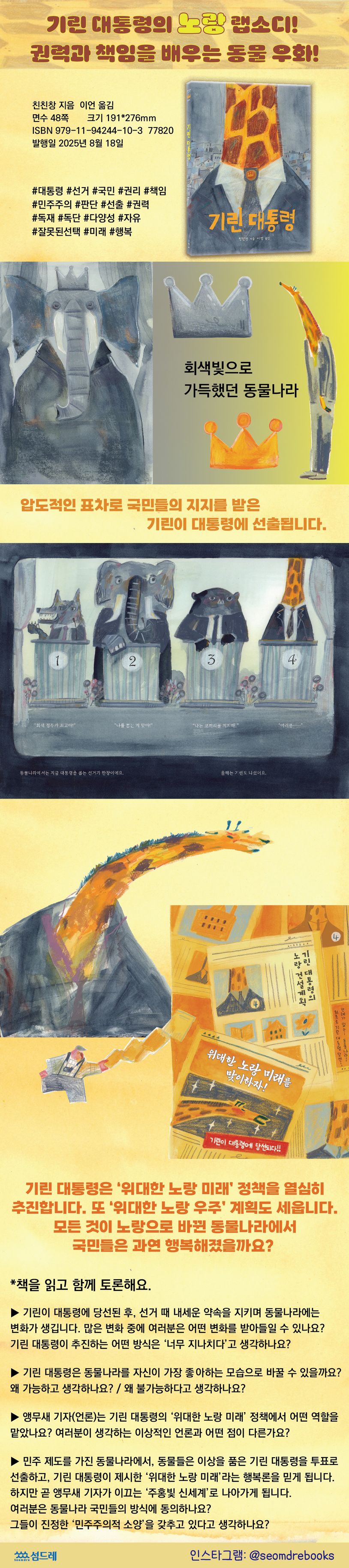 동물나라에서 대통령 선거 유세가 한창입니다. 회색빛 가득한 동물나라에 노란 기린 대통령이 선출됐어요. ‘위대한 노랑 미래’ 정책을 열심히 추진한 기린 대통령은 온 국민이 노란색을 가장 좋아하게 만들었지요. 하지만, 우주는? 광활한 우주 역시 가장 멋진 노란색으로 물들여야 하지 않을까요? 기린 대통령의 꿈인 ‘위대한 노랑 우주’ 계획은 어떻게 진행될까요? 국민들이 행복한 나라가 완성될수 있을까요?