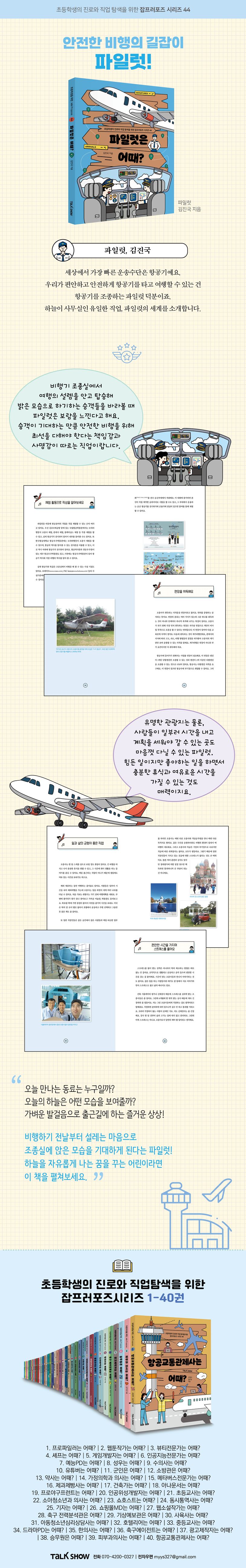 커다란 항공기가 공기보다 더 가볍게 하늘을 가로질러 날아가는 모습은 언제 봐도 놀라워요. 그 매력 때문에 파일럿을 꿈꾸는 사람도 많아요. 이 책은 파일럿이 되려면 지금부터 관리하고 준비할 것은 무엇인지, 파일럿이 되기 위해 어떤 곳으로 진학하는 게 좋을지, 파일럿이 되고 나서도 꾸준히 해야 하는 일은 무엇인지 등, 파일럿에 관한 궁금한 것들 담았어요. 35년 이상 조종사로 일하고 있는데도 아직 출근하는 발걸음이 즐겁다는 저자의 솔직한 이야기도 들어보세요.