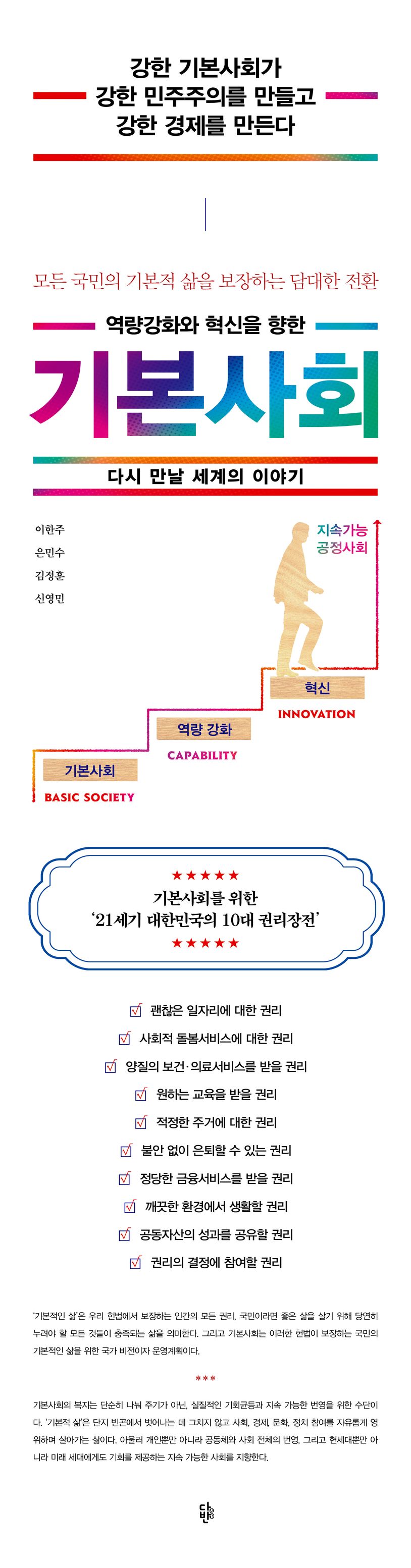 기본사회는 ‘모든 사람에게 기본적인 삶이 보장되는 사회’로 정의할 수 있지만, 이에 대해 구체적으로 소개된 바가 없어 기본소득이나 단순한 복지 개념으로만 잘못 이해되는 경우가 많다. 이 책에서는 우리 헌법이 보장하는 ‘기본적 삶’이란 무엇인지, 기본사회의 의미가 무엇이며 왜 우리에게 필요한지, 기본사회와 성장은 어떠한 관계가 있으며 구체적으로 어떠한 정책과 제도로 움직이는지, 미래의 기본사회는 어떠한 모습일지 등을 상세히 설명한다.
