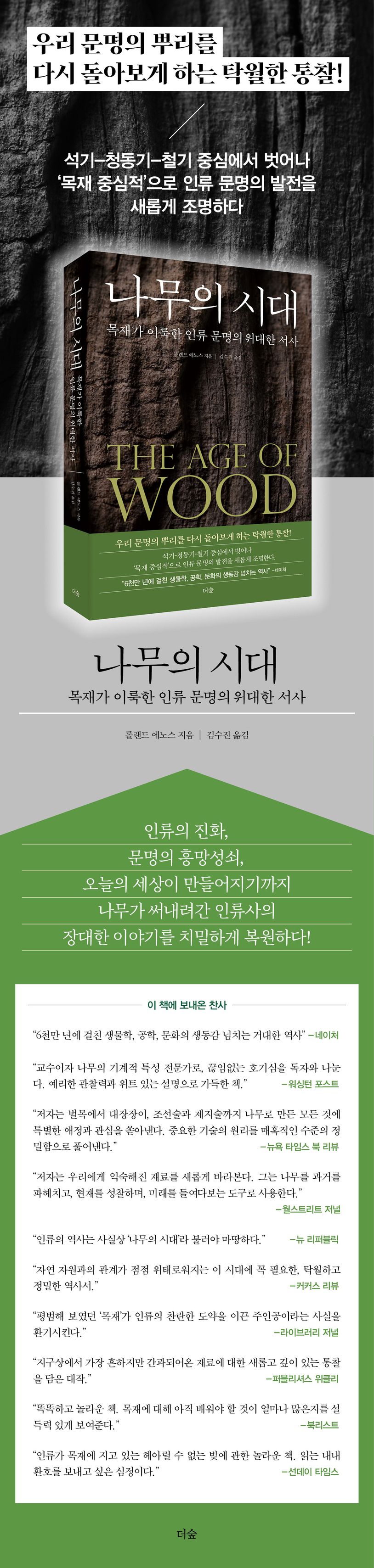 돌ㆍ청동ㆍ철이라는 세 가지 재료로 인류 역사를 구분하는 전통적 서사에서 한 걸음 벗어나, 인류 문명에게 가장 친숙하고 유용한 재료라 할 수 있는 ‘목재’의 관점에서 새롭게 조명하는 인류문명서. 인류가 진화하고, 문명이 흥망성쇠를 거듭하며, 지금 모습의 세상이 만들어지기까지 나무가 어떤 역할을 했는지를 파헤치고 분석한 책으로, 출간 즉시 〈워싱턴포스트〉 〈뉴욕 타임스〉 〈월스트리트저널〉 〈네이처〉 등 세계적 언론과 학술지로부터 일제히 찬사와 주목을 받았다.