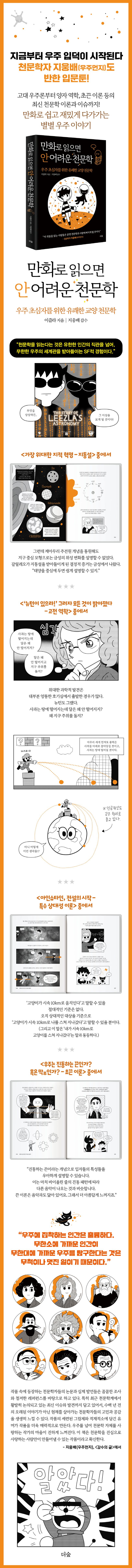 철학과 뇌과학 같은 낯설고 어려운 분야의 주제를 만화를 통해 자신만의 색으로 쉽고 재밌게 풀어내 온 저자가, 이번에는 무한한 우주와 천문학의 세계를 알차게 담아낸 교양 만화를 선보였다.