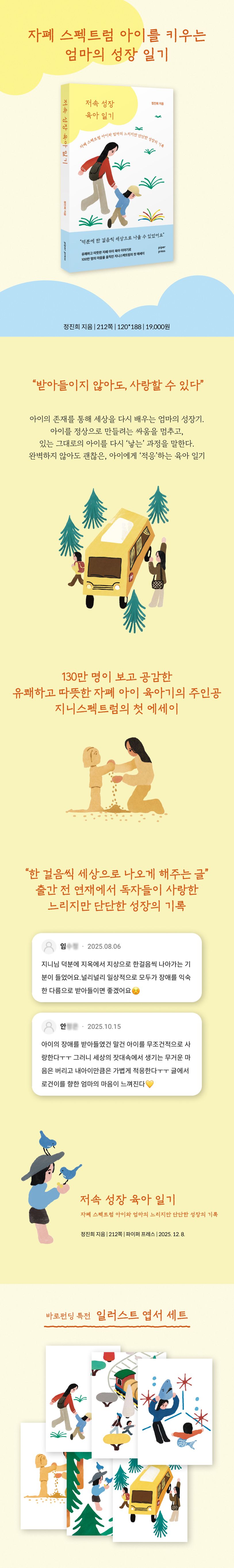 『저속 성장 육아 일기』는 ‘받아들임’이 아니라 ‘적응’을 이야기한다. 완벽하지 않아도 괜찮고, 여전히 흔들리면서도 단단하게 살아갈 수 있다는 사실을, 그는 오늘도 가볍게 웃으며 증명해 보인다.