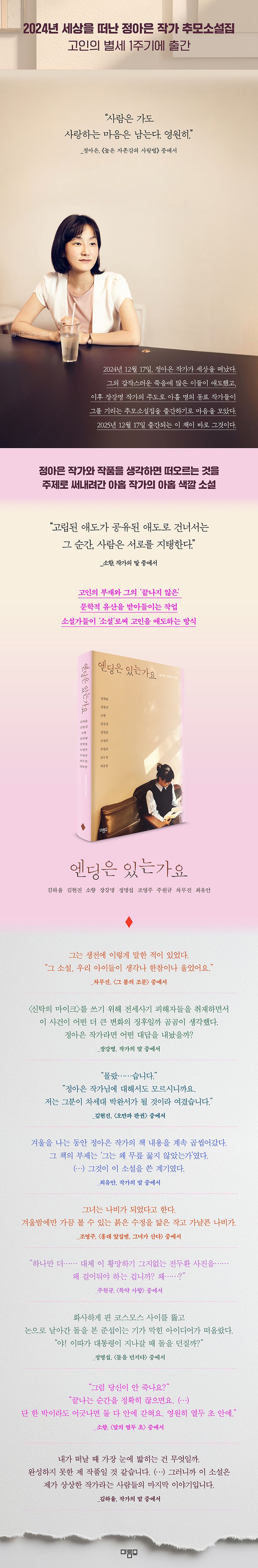 2013년한겨레문학상을받으며데뷔한정아은작가는생전에공저포함일곱권의소설과다섯권의논픽션/에세이를썼다.“교육현장,외모지상주의,노동의소외,대중의광기,지식인의위선등당대첨예한현실”을소재로삼았다.픽션과논픽션을넘나들며우리가사는현실의문제들에진지하게천착해온그의작업의동력은,많은이들이증언하듯타자에대한사랑이었다.그는“세상을이해하고자기사고를발전시키려끊임없이노력하는사람,집단의분위기에자기가해야할판단을맡기지않는사람,사실을존중하는사람”(장강명)이었다.선후배동료작가들의작품에말과글로관심과애정을표했고,타인과세상만물에대한호기심과탐구심을작품에녹여냈다.이추모소설집《엔딩은있는가요》는소설가들이소설을통해고인을기리며그의‘끝나지않은’문학적유산을받아들이는작업이다.