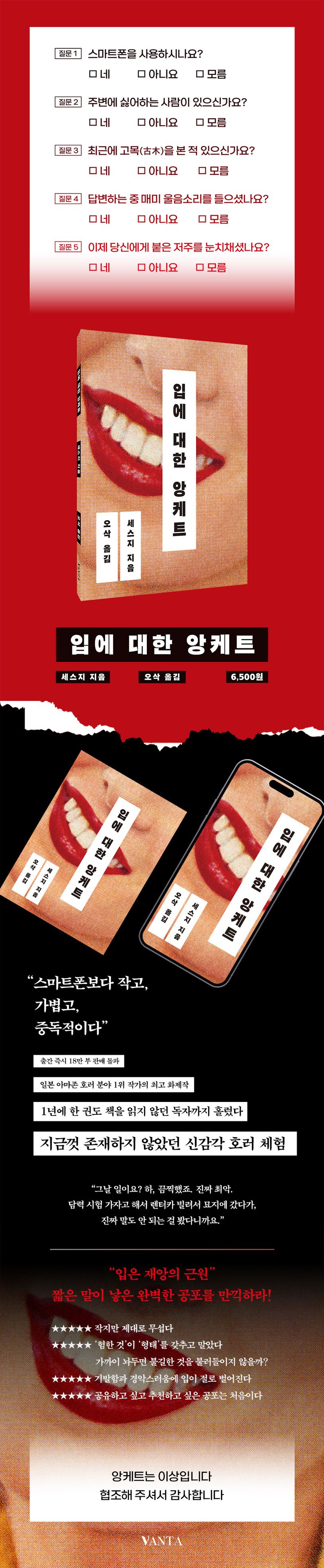 발표하는 작품마다 실제와 허구의 경계를 허물어뜨리는 전무후무한 기법을 선보여 일본에서 호러 붐을 일으키고 있는 신예 작가 세스지의 『입에 대한 앙케트』가 VANTA(반타)에서 출간된다.