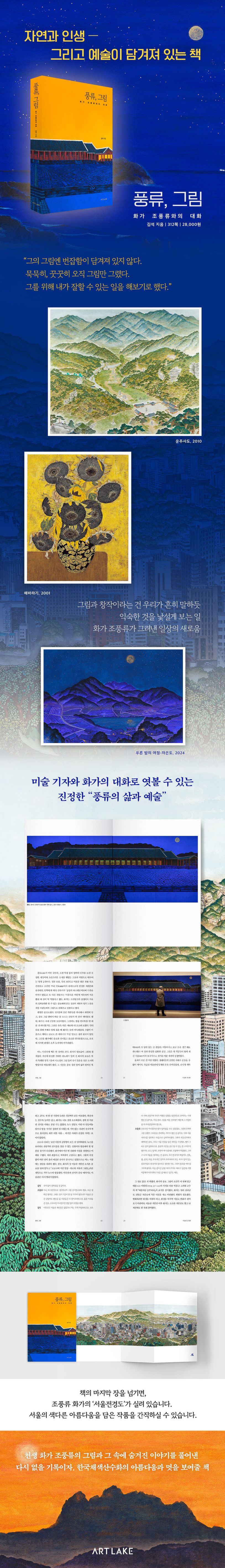 이 하나의 물음으로 시작된 이야기는 색다른 전개 방식을 취한다. 바로 화가와 미술전문기자의 만남. 둘만이 아니 둘밖에 나눌 수 없는 대화를 책 속에 그림과 함께 담아냈다. 초창기 그림부터 지금의 그림까지 수록했으며, 익숙한 풍경도 다르게 보는 그의 색다른 시선과 독창적 기법으로 한국의 산천초목의 또 다른 아름다움을 발견하게 될 것이며, 한 장씩 넘길 때마다 조풍류가 그려내는 한국 채색산수화의 매력과 깊이감을 고스란히 느낄 수 있을 것이다.
