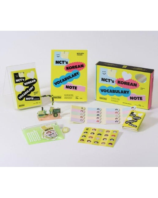 NCT팬들이한글을쉽고재미있게그리고명확하게배우기를바라는마음을담아세트를구성하였다.특별세트에는본책외에책에등장하는450개의단어를복습할수있는단어장을제공한다.함께제공되는접착메모지(NCT19멤버의캐릭터로디자인)를활용하여효율적으로공부할수있다.모르는단어에좋아하는멤버의얼굴이디자인된메모지를부착하며공부한다면즐겁게단어를외울수있을것이다.