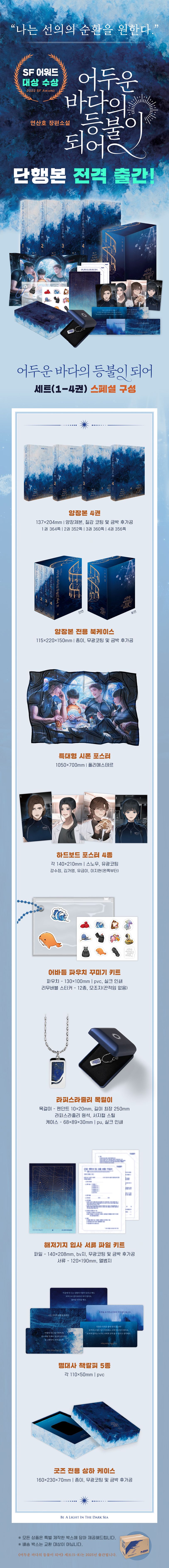 《어두운 바다의 등불이 되어》 세트(1-4)는 전체 이야기 중 절반에 해당하는 분량으로, 시리즈 완결인 《어두운 바다의 등불이 되어》 세트(5-8)는 2025년 출간될 예정이다. 반년에 걸친 섬세한 개고 작업을 통해 준비되었으며 1권 첫머리에 특별 서문 ‘불타고 익사하는 세상에서 사는 방법’을 붙였다. 고급스러운 유화풍 디자인에 견고한 양장 제본으로 소장 가치를 더한 이번 단행본은 오랜 시간 《어두운 바다의 등불이 되어》를 사랑해온 독자에게 더없이 즐거운 선물이 될 것이다.