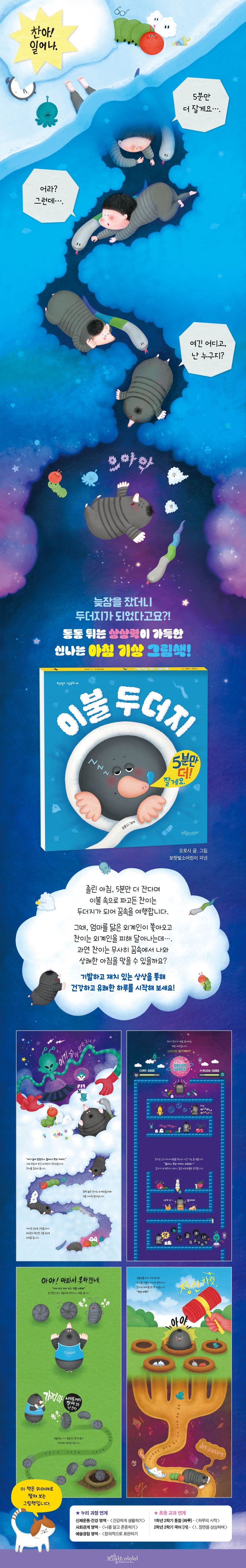 보랏빛소 그림동화 시리즈 46번째 책 《이불 두더지》는 늦잠꾸러기 아이가 꿈나라 속 상상의 세계와 현실을 재치 있게 넘나들며 아침을 맞는 과정을 그린 아침 기상 그림책이에요. 아침이 되자 엄마의 일어나라는 목소리가 들려옵니다. 하지만 주인공 찬이는 이렇게 겨우 대답하지요. “으음… 5분만 더… 잘게요.” 그러자 찬이의 입이 점점 튀어나오고, 손은 점점 커지더니, 찬이가 두더지가 되었지 뭐예요? 두더지로 변한 찬이는 이불 속으로 파고들고, 엄마를 닮은 외계인은 매섭게 뒤를 쫓아오는데… 과연 찬이에게는 어떤 일이 펼쳐질까요?