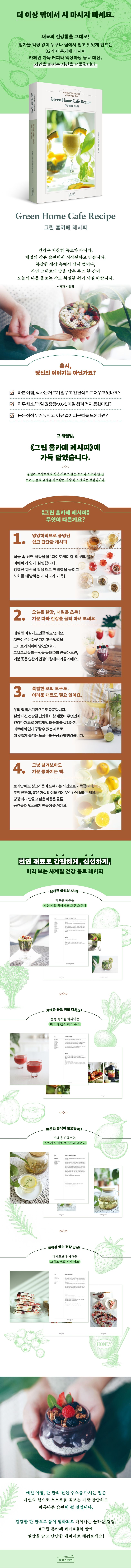 《그린 홈카페 레시피》는 제철 재료, 자연의 재료로 집에서 간편하게 만드는 건강 음료 책이다. 건강은 특별한 행위가 아니라 매일의 습관이라는 믿음으로 누구나 쉽게 실천할 수 있는 건강하고 아름다운 식생활을 소개한다. 잃어버린 식습관을 되찾고 몸의 균형을 바로잡는 데 도움이 될 건강식을 모았다. 가공식품과 첨가물이 익숙해진 현대의 식생활 속에서 재료 본연의 색과 향을 그대로 살린 주스와 스무디를 통해 ‘자연을 마시는 시간’을 선물한다.