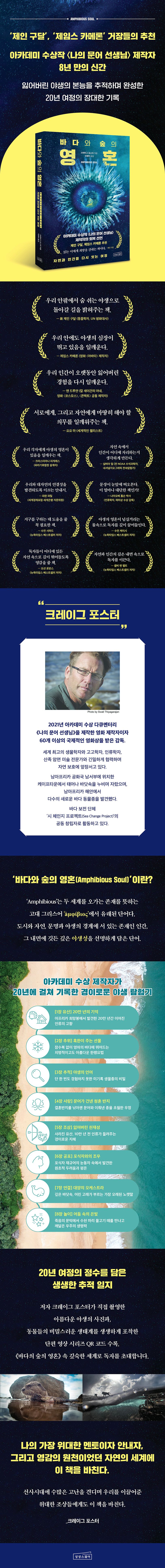 『바다와 숲의 영혼』은 아카데미상 수상작 [나의 문어 선생님] 제작자 크레이그 포스터가 20년간 아프리카 24개국의 야생을 탐험하며 인간 본성을 회복한 기록이다. 침팬지 연구의 선구자 제인 구달, [아바타] 감독 제임스 카메론, 칼 세이건의 아내이자 [코스모스], [콘택트] 공동 제작자인 앤 드루얀 등 자연, 과학, 예술계의 거장들이 한목소리로 극찬한 바 있다.