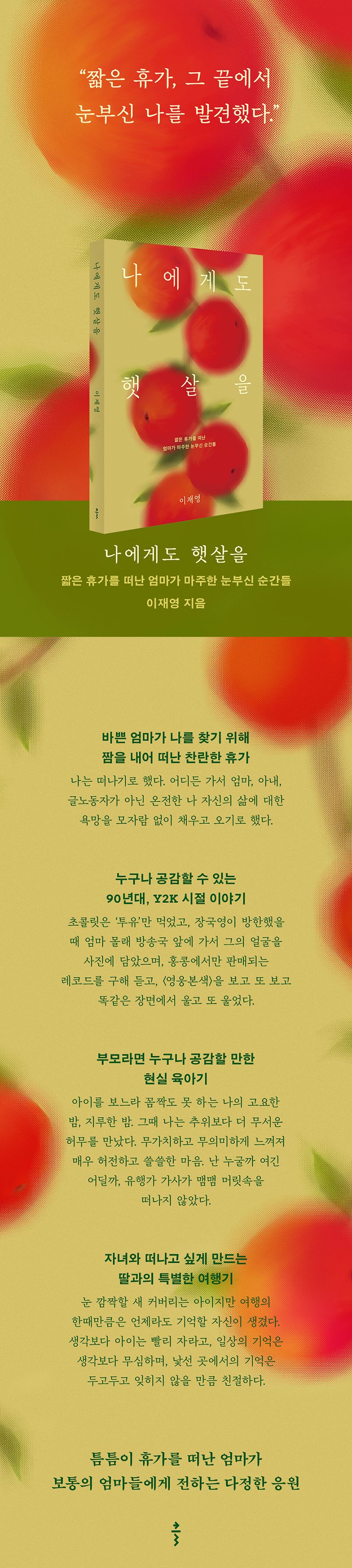 글 쓰는 일을 하면서 아이를 키우는 엄마의 짧은 휴가를 담은 에세이. 엄마와 글노동자라는 여러 역할을 해내느라 버거워질 때 저자 이재영은 짬을 내어 낯선 곳으로 떠났다. 일단 답답 함을 해소하고자 떠났지만 일상을 벗어난 새로운 장소에 가면 늘 추억이 떠올랐다. 그 추억을 되새기다보면 그냥 흘러가는 줄 알던 시간들도 모두 소중하고 빛나는 날들이었음을 깨달았다. 더불어 나도 눈부신 사람이라는 것도. 『나에게도 햇살을』은 나도 당신도 늘 반짝반짝한 사람 이라는 걸 일깨워주는 책이자 모든 엄마를 향한 응원을 담은 엄마의 에세이다.