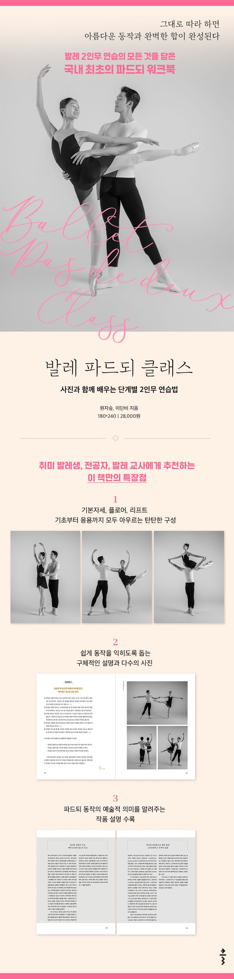 발레를 취미로 하는 사람들이 늘고 세계 무대에서 활약하는 무용수도 배출되고 있지만, 정작 체계적으로 발레 연습법을 정리한 책은 국내에서 찾아보기 어렵다. 《발레 파드되 클래스》는 이러한 갈증을 해소해줄 국내 최초의 파드되 워크북이다.