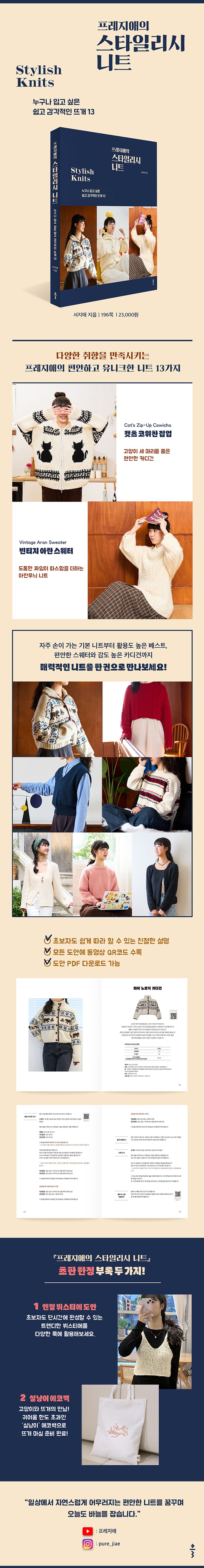 다양한 SNS 채널을 통해 뜨개의 즐거움을 전하는 뜨개 크리에이터 프레지애의 첫 작품집이 출간되었다. 뜨개를 보다 친숙한 취미로 제안해 온 저자는 이번 책에서 오랫동안 사랑받은 인기 니트 6종에 미공개 신작 7종을 더해, 누구나 입고 싶은 13가지 니트웨어를 선보인다.