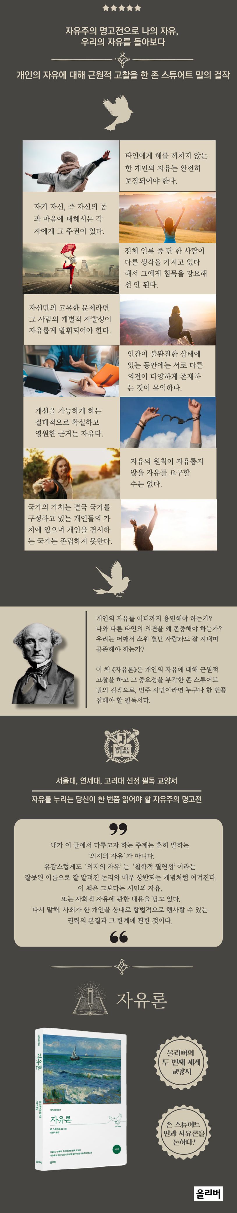 이제 이 책 《자유론》으로 우리가 누리고 있는 자유, 온전히 누려야 할 자유를 새삼 돌아보고 깊이 있게 성찰해보자.
