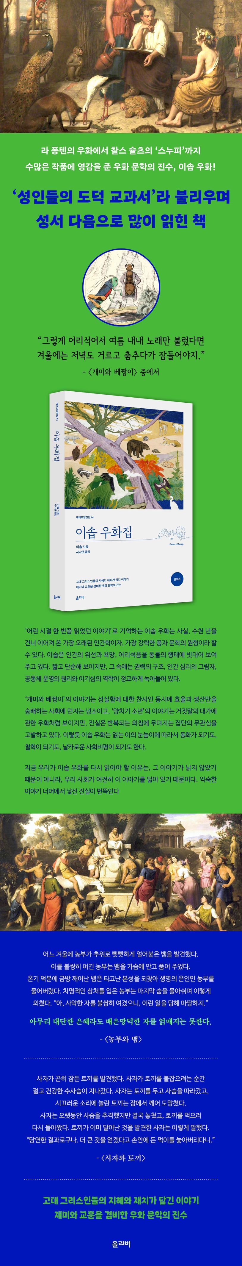 ‘어린 시절 한 번쯤 읽었던 이야기’로 기억하는 ‘이솝 우화’는 사실, 수천 년을 건너 이어져 온 가장 오래된 인간학이자, 가장 강력한 풍자 문학의 원형이라 할 수 있다. 이솝 우화는 인간의 위선과 욕망, 어리석음을 동물의 행태에 빗대어 보여 주고 있는데, 짧고 단순해 보이는 그 이야기들 속에는 권력의 구조, 인간 심리의 그림자, 공동체 운영의 원리와 이기심의 역학이 정교하게 녹아들어 있다. 이런 이유로 이솝의 우화가 던지는 질문, 가령 ‘어떻게 살아야 하는가?’ ‘무엇이 인간을 인간답게 만드는가?’ 같은 질문들은 오늘을 사는 우리에게도 여전히 유효하다. 표면적으로는 동물과 신, 인간이 등장하는 짧은 에피소드에 불과한 우화들이건만, 그 우화들의 이면에는 인간 조건에 대한 날카로운 인식과 현실 인류학적 통찰이 스며들어 있다. 그래서 우리에게 ‘이솝 우화’는 단지 ‘옛날 이야기’가 아니다. 2,500년 전 고대 그리스인들의 지혜와 재치가 담긴 이솝 우화를 지금 우리가 다시 읽어야 하는 이유는, 그 이야기가 낡지 않았기 때문이 아니라, 우리 사회가 여전히 이 이야기를 닮아 있기 때문이다. 익숙한 이야기 너머에서 낯선 진실이 번뜩인다.