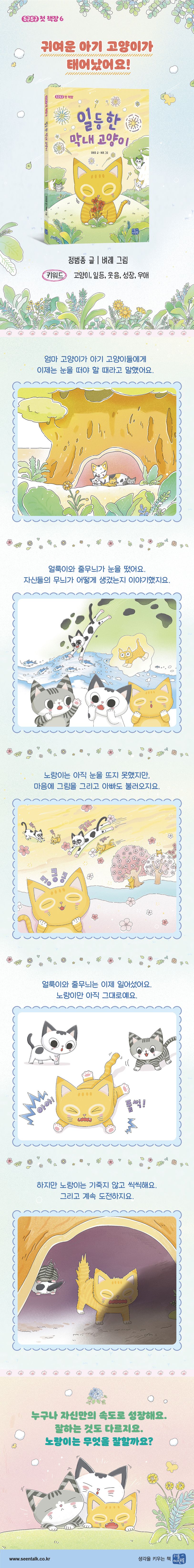 [두근두근첫책장]은초등학교입학을앞둔어린이부터초등저학년어린이까지,동화책을처음읽기시작한독자를위해만든창작동화시리즈입니다.어린이의마음으로세상을읽고싶은부모님,선생님모두가함께보면좋은이야기들로한권한권채워나갈거예요.★눈을뜨고,일어서고성장해요아기고양이들은태어난지얼마안되었어요.아직눈도뜨지못했지요.엄마고양이는이제눈을떠야할때라고말했어요.가장먼저태어난얼룩이는이번에도자신이일등으로눈을뜰거라고했어요.줄무늬는자신의줄무늬도궁금하고,엄마도보고싶었지요.하지만노랑이는아직눈을뜨고싶지않았어요.얼마안있어얼룩이와줄무늬는눈을떴어요.하지만노랑이는아직이에요.얼룩이와줄무늬는눈을뜨자다리에힘을주고일어서려고노력했어요.노랑이도아직눈을뜨지는못했지만일어서는것만큼은일등을하고싶어서다리에힘을주었지만쉽지않았어요.얼룩이와줄무늬는일어서는것도성공했어요.노랑이는아직일어서지못했지만그래도씩씩해요.계속도전하고자신이누구보다도먼저할수있는것은무엇일지찾거든요.그리고누구나자신만의속도를가지고성장해요.조금늦다고조급해하지말고씩씩하게자신이할수있는것을찾아보세요.★막내고양이의웃음얼룩이와줄무늬가눈을뜨고일어섰지만,막내고양이노랑이는아직그대로예요.그래서어떻게하면다른것에서일등을하면서동시에눈을뜰수있을까생각하지요.노랑이는포기하지않았어요.씩씩하게도전을계속하지요.발을질질끄는수상한소리가들렸을때도물러서지않고다리에힘을주고일어났어요.얼룩이와줄무늬에게도물러서지말라고말해요.눈이보이고네다리도일어섰지만노랑이가제일씩씩하고용감해요.결국얼굴에웃음을띠고하얀꽃송이같은눈을반짝이지요.웃음은소중해요.노랑이처럼씩씩하게도전하고많이웃어보세요.누구보다많이웃으면진정한일등이될수있을거예요.교과연계국어1-17.생각을나타내요8.소리내어또박또박읽어요국어1-210.인물의말과행동을상상해요국어2-14.말놀이를해요8.마음을짐작해요10.다른사람을생각해요11.상상의날개를펴요국어2-21.장면을떠올리며4.인물의마음을짐작해요7.일이일어난차례를살펴요9.주요내용을찾아요10.칭찬하는말을주고받아요국어3-15.중요한내용을적어요10.문학의향기국어3-24.작품의재미를느껴요8.글의흐름을따라*인증유형:공급자적합성확인