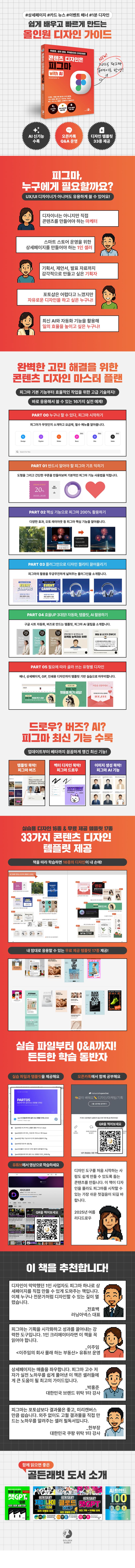 기본 개념을 익힌 후 연습과 실전 예제가 이어지기 때문에 카드 뉴스, 상세페이지, 배너, 인쇄물까지 직접 만들어보며 디자인의 기초와 응용을 함께 익힐 수 있습니다. 또한 구글 시트와 연동한 자동화, 버즈를 활용한 템플릿 디자인까지 바쁜 현대 사회에 시간을 아낄 수 있는 실전 노하우도 풍부하게 담았습니다.