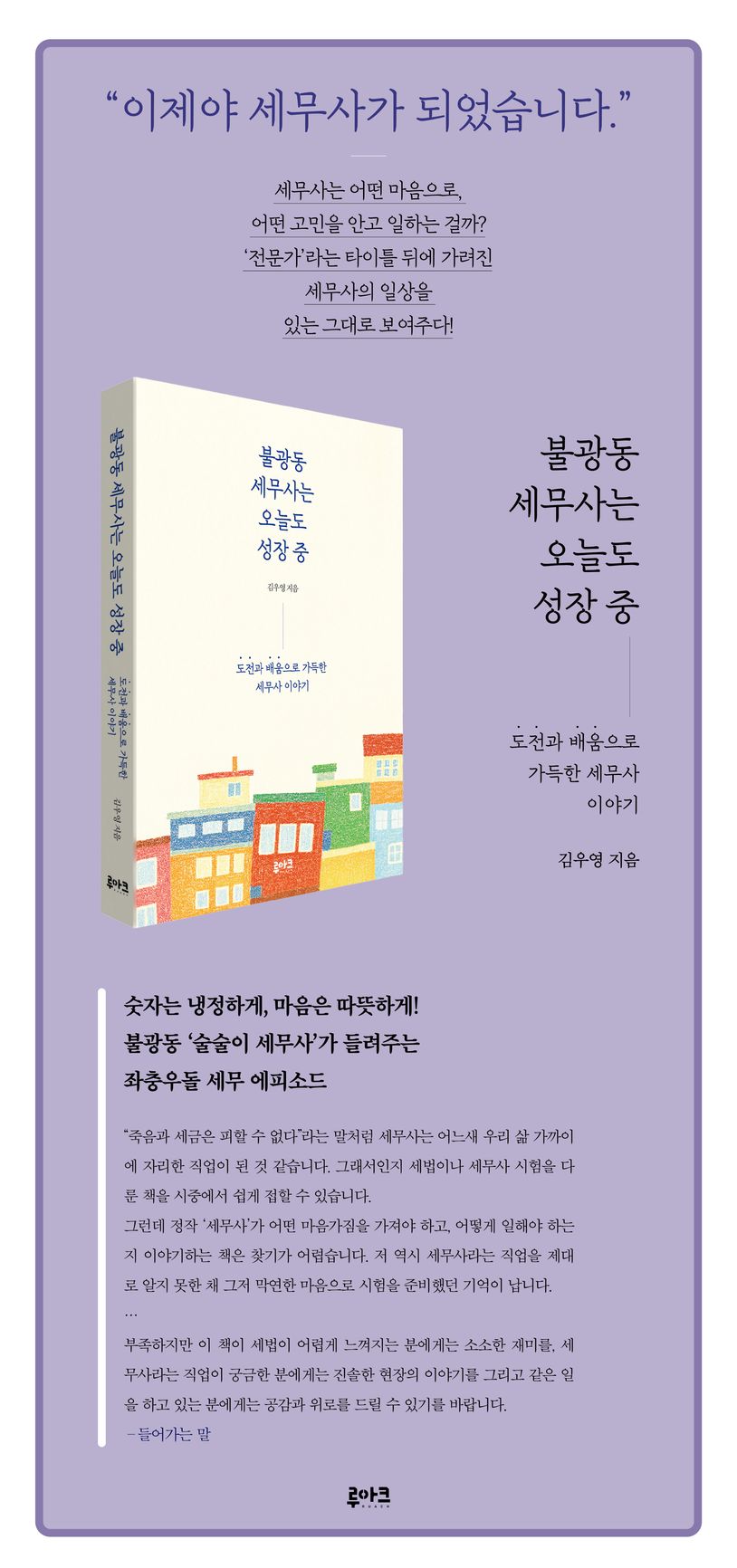 숫자는냉정하게,마음은따뜻하게!불광동‘술술이세무사’가들려주는좌충우돌세무에피소드동네를걷다보면‘세무사사무소’라는간판을어렵지않게볼수있다.그만큼‘세무사’라는직업이우리일상에깊이자리잡았다는뜻일것이다.살다보면누구나한번쯤세무사의도움을받아야하는순간이오기마련이다.이처럼‘세무사’는우리에게익숙하면서도중요한존재가되었지만,정작그일의속내까지들여다볼기회는많지않다.세무사는어떤마음으로어떤고민을안고일하는걸까?세법을다룬책이나영상은넘쳐나지만정작그일을하는사람에대한이야기는좀처럼접하기어렵다.이책은바로그빈자리,곧세무사라는‘사람’에대한이야기를담고있다.서울은평구불광동,작은원룸에자리잡은개업세무사의일상은결코순탄치않았다.개업초창기,지은이는막막한마음에전단지를돌리며하루를시작하기도했고,홍보에도움이될까싶어참석한모임에서명함조차꺼내지못한채돌아선적도있다.“몇개월무료예요?”라는고객의질문앞에서는가치관이흔들리는괴로움을맛보기도했으며,정성을들여준비한상담이끝내계약으로이어지지않아허탈했던순간도있었다.하지만작은사무실에서처음으로기장계약을체결하던날의벅찬떨림,국선대리인으로서영세납세자의억울함을해소했을때의보람,상속세상담과정에서가족간의얽힌관계를풀어주었을때느꼈던뿌듯함같은감정들을함께경험하면서지은이는‘세무’라는일에정진할동기와힘을얻을수있었다.이책《불광동세무사는오늘도성장중》에는화려하지않지만,바로그렇기때문에무척현실적으로다가오는세무에피소드들이담겨있다.이를통해지은이는‘전문가’라는타이틀뒤에가려진불안정한노동자이자한인간으로서세무사의모습을있는그대로보여준다.지은이는세무사라는직업을“끝없이공부해야하는일”이라고말한다.그러나그배움의끝에남는것은차가운숫자가아니라결국‘사람’이라고고백한다.고객과직원그리고원칙을지키기위해내려야했던결정들은세무가단순한서비스를넘어타인의삶에직간접적으로영향을미치는일임을일깨운다.이책의가장큰미덕은세무업무를둘러싼노동의현실을애써포장하지않는다는데있다.세무사는고도의전문지식을요구받는직업이지만,동시에가격경쟁이나고객의불신앞에서흔들릴수밖에없는자영업자이기도하다.지은이는세무라는일에따르는책임의무게를구체적인사례로풀어내며이일이얼마나섬세한판단위에놓여있는지차분히짚어나간다.그렇다고책이냉혹한현실만이야기하는것은아니다.이야기의중심에는언제나‘따뜻함’이있다.의뢰인의마음을먼저헤아리고,꼼수를부리거나편법을택하고싶은유혹앞에서끝내타협하지않았던모습들이에피소드곳곳에배어있다.그선택이언제나옳았는지는알수없지만,지은이는그과정에서품었던고민을숨김없이드러냄으로써책임있는전문성이란무엇인지생각하게한다.책의마지막페이지를덮을즈음,독자는한문장을만나게된다.“좋은세무사는좋은사람이다.”이는쉽지않은과정들을지나마침내도착한자리에서선물처럼주어진값진깨달음이다.함께울고웃다보면어느새지은이의성장에조용히발걸음을맞추고있는자신을마주하게된다.이책은세무사를꿈꾸는이들에게는가장현실적인직업안내서가될것이고,이미현장에서일하고있는세무사나전문직종사자들에게는자신의이야기를발견하게하는깊은공감과위로가될것이다.