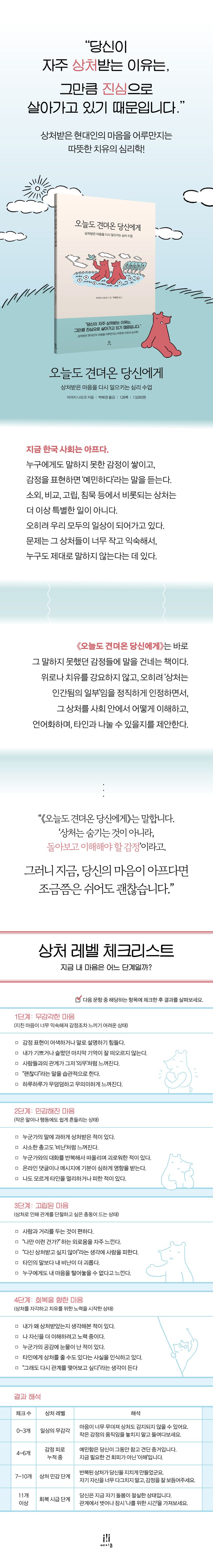 일본 트라우마 심리학의 최고 권위자, 미야지 나오코 교수의 최신작! 이 책에서 미야지 나오코 교수는 현대인이 겪는 일상의 상처를 심리학적·사회문화적 관점에서 깊이 있게 분석하며, 상처를 단순한 개인의 약함이 아닌 현대 사회의 구조적 결과물로 바라본다. 또한, 눈에 보이지 않는 ‘작고 반복적인 상처’가 개인의 삶에 얼마나 큰 영향을 미치는지를 조명하며, 상처를 지우는 것이 아니라 이해하고 함께 살아가는 법을 제안한다. 아울러 ‘연결의 피로’, ‘디지털 시대의 감정노출’, ‘공감의 공동체’ 등 현대 사회 특유의 상처 환경을 날카롭게 통찰하면서, 성찰과 관계 회복의 용기를 건넨다. 그런 점에서 볼 때 이 책은 상처를 딛고 살아가는 법을 배우는 감정 회복의 심리학이자, 관계의 윤리를 새롭게 모색하는 공감 인문서라고 할 수 있다.