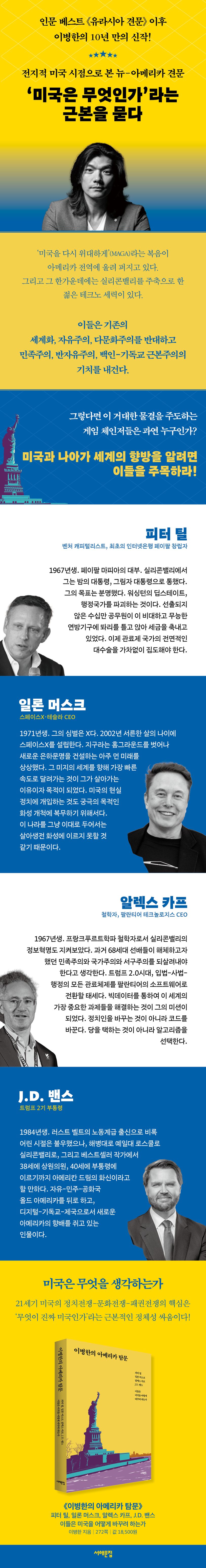 미국과 나아가 세계의 향방을 알려면 이 4인방의 면면을 깊이 학습하고 탐구해야 한다. 이 책은 바로 그 ‘탐문’의 첫 책이자, 유일한 책이다. ‘전지적 미국 시점’으로, 문명의 대전환을 맞이하고 있는 아메리카의 한복판으로 깊숙이 들어간다.