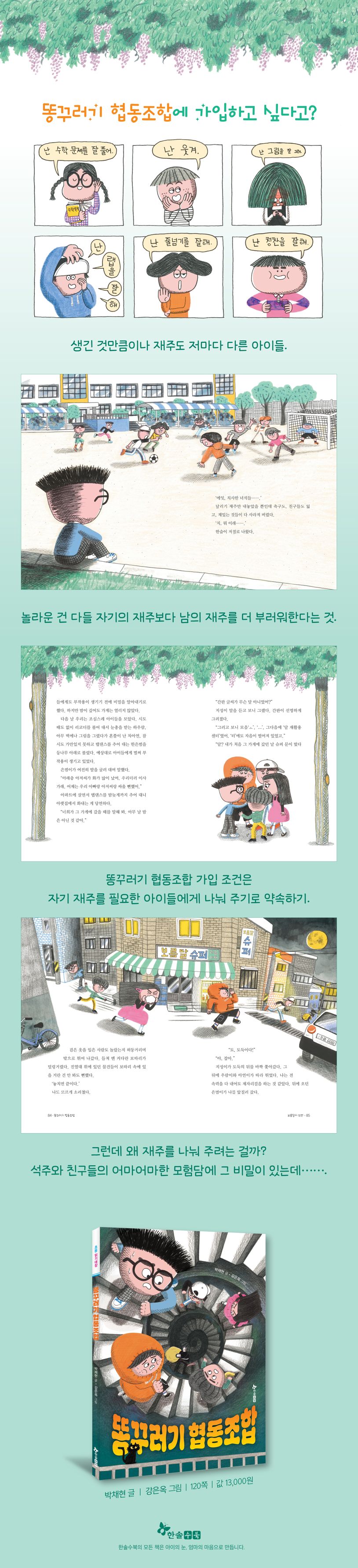 《똥꾸러기 협동조합》의 주인공 지석주는 학원에서 나머지 공부를 하고 집으로 돌아오던 길에 이상한 가게를 발견해요. 길고양이가 앙칼지게 울어대는 으스스한 밤, 노란 불이 켜진 낡은 건물이 눈에 딱 들어오지요. 그런데 희뿌연 먼지가 더께더께 앉은 유리문을 밀고 들어간 가게에는 낡은 물건들 사이에 ‘소원을 들어주는 축음기’가 있는 게 아니에요. 소원을 들어주다니 사실일까요?