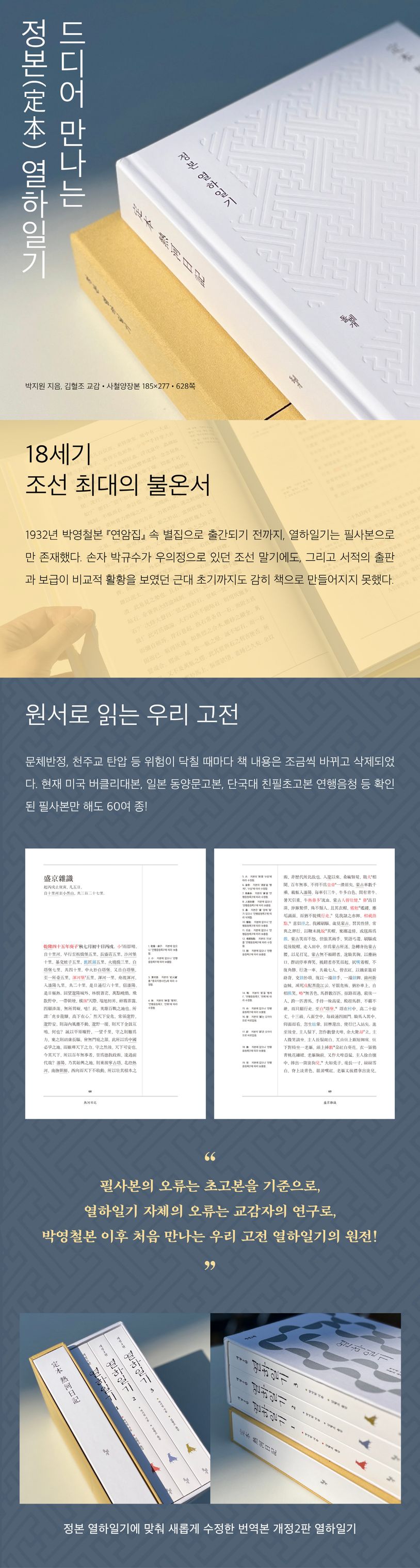 한때 ‘해리포터 시리즈’가 극장가를 풍미하자 영화와 함께 조앤 롤링의 책을 원서로 읽는 붐이 일었다. 10년 영어공부를 1년 만에 끝낸다는 둥, 여기저기서 원서로 ‘해리포터’를 읽는 방법을 포스팅하고 덩달아 책 판매도 뛰었다. 그렇다면 우리 고전의 경우는 어떠한가? 원서는 고사하고, 축약하지 않은 완역서도 찾아보기 어렵다. 『금오신화』, 『춘향전』, 『홍길동전』을 완역본으로 읽은 독자가 얼마나 있을까? 이것이 우리 고전의 현주소이고 수준일 것이다. 『정본 열하일기』가 이렇게 출간될 수 있는 것은, 성가(聲價)가 높은, 민족 최고의 고전이라는 명성 덕이다. 『열하일기』 정본 작업은 우리 문화가 한 걸음 더 내딛는 큰 성과라 해도 과언이 아닐 것이다.