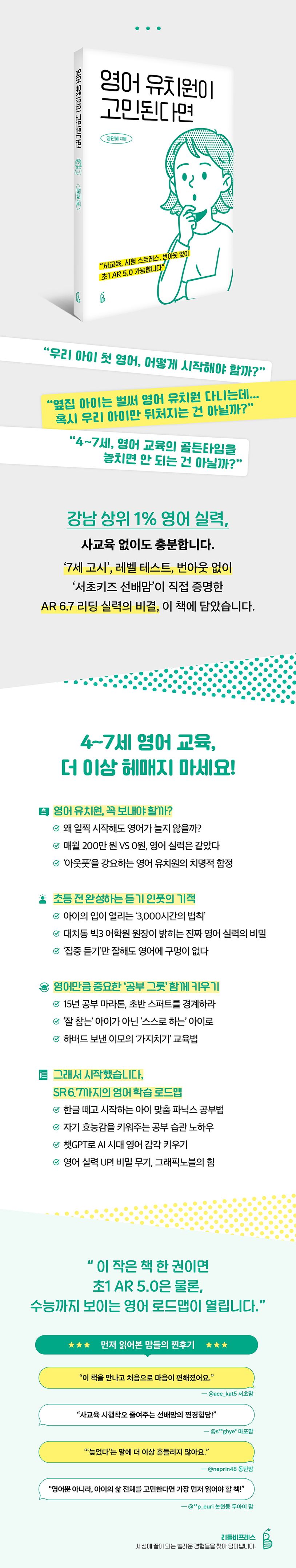 『영어 유치원이 고민된다면』은 영어 앞에서 망설이는 이런 부모의 마음을 가장 잘 아는 선배맘의 따뜻하고 현실적인 조언을 담은 책이다. 값비싼 사교육 없이, 하루 2시간 영상과 책을 꾸준히 접해주는루틴만으로 초등 1학년 AR 5.0 리딩 실력을 만든 경험과 그 노하우를 고스란히 담았다.