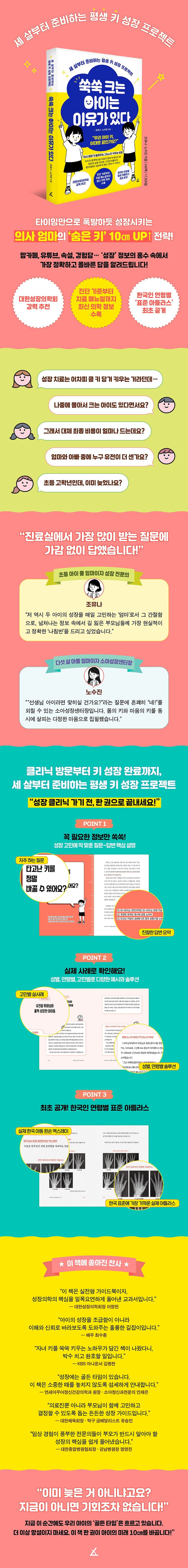 『쑥쑥 크는 아이는 이유가 있다』는 그런 엄마들의 마음을 누구보다 잘 아는 성장 클리닉 ‘의사 엄마’ 두 사람이, 더는 고민할 일 없게끔 정확하고 확실한 답을 쉽게 정리한 책이다. 저자들은 이 책을 통해 ‘성장 치료를 받을지 말지’라는 이분법적 접근을 넘어, 부모가 반드시 알아야 할 생애 주기별 키 성장의 핵심 타이밍과 개입 지점을 명쾌하게 제시한다. 또한 아이의 타고난 체질과 성장 리듬에 따라 필요한 정보를 큐레이션해주고, 가장 현실적인 성장 솔루션을 내놓는다.