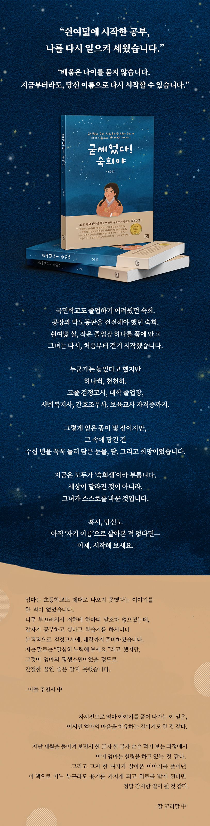 1959년생,이숙희입니다.국민학교5학년때,집안사정으로학교를그만두었습니다.그때부터지금까지제이름앞에늘따라붙었던말,‘국민학교도못나온사람’과장공장,섬유공장,아파트건설현장까지두손으로가족을일으키면서도마음한편에는늘‘공부’가남아있었습니다.국민학교를중퇴했다는사실이가난보다더,육체노동보다더저를작아지게만들었습니다.쉰여덟에용기를내어꺼낸그단어.그리고다시시작한공부.초등학교검정고시부터대학교졸업까지,지금은간호조무사로제2의인생을살고있습니다.2022년경남신중년인생이모작공모전에서최우수상을수상하며제이야기를세상에들려줄용기를얻었습니다.혹시,마음속에오래된꿈하나쯤품고계신가요?‘굳세었던숙희’의이야기가누군가의한걸음이될수있기를바랍니다.