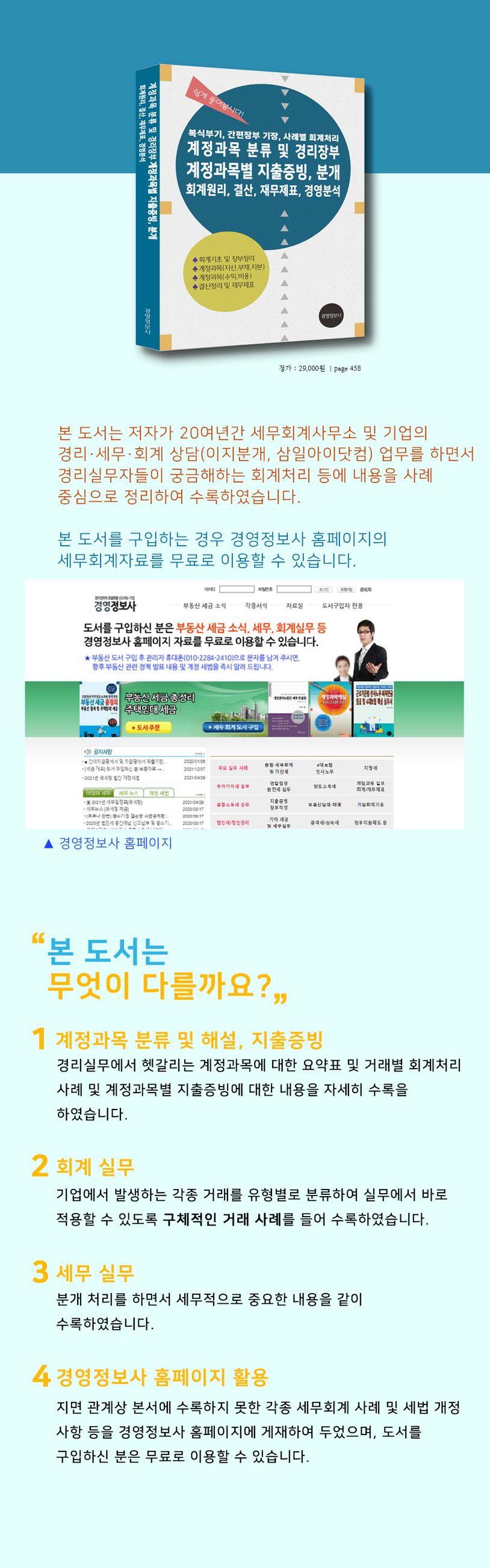 계정과목 분류 및 경리장부, 계정과목별 지출증빙, 분개, 회계원리, 결산, 재무제표, 경영분석 (복식부기, 간편장부 기장, 사례별 회계처리)