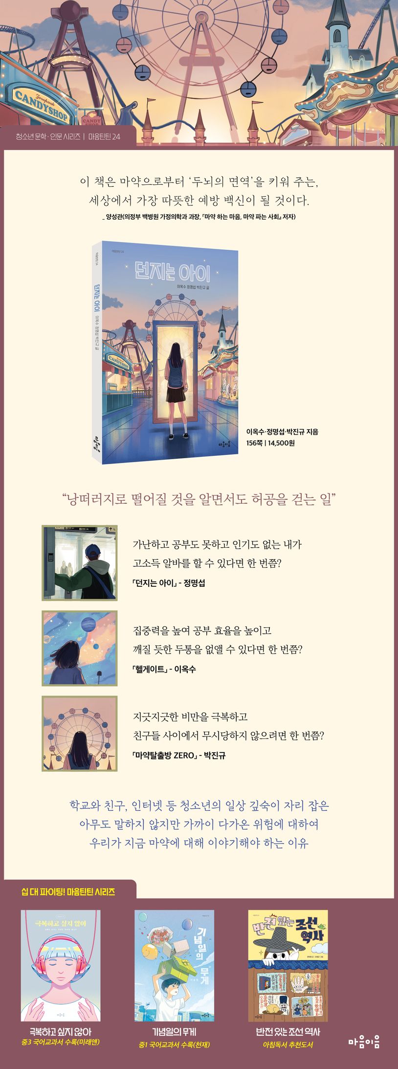 「던지는 아이」에서 고수익 알바를 구해 신이 난 중학생 현우는 자신이 배달하는 물건이 마약이라는 사실을 어렴풋이 알고 있지만 상관없다. 집안 형편도 나쁘고 공부도 못하는 자신에게 이 알바는 행운이니까. 그러던 어느 날, 뜻밖의 장소에 마약 ‘던지기’를 하고 오라는 지시를 받고 뭔가 잘못되고 있다는 사실을 눈치챈다. 과연 현우의 뒤를 밟는 그림자는 누구일까?