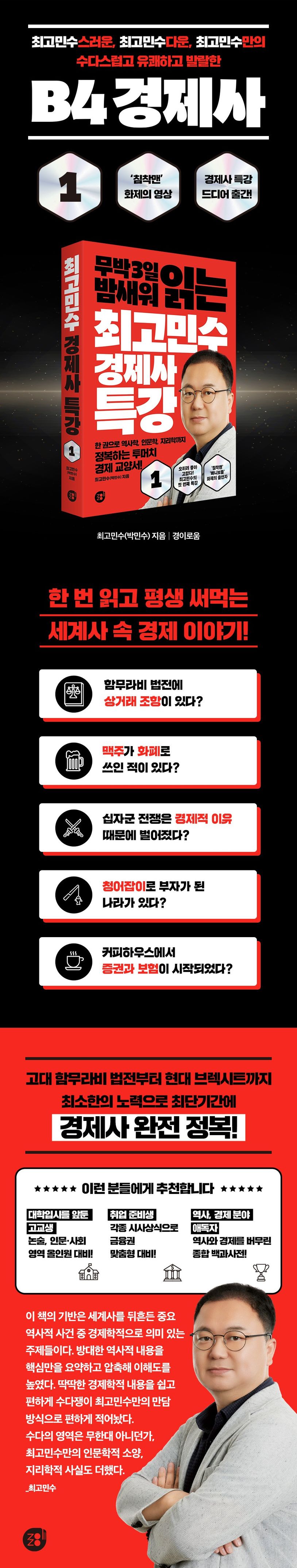 유튜브 채널 ‘침착맨’, ‘빠니보틀’에서 뛰어난 입담으로 강렬한 인상을 남긴 ‘최고민수’가 145만 뷰를 넘긴 화제의 영상 ‘경제사 특강’을 모티브로 한 『최고민수 경제사 특강 1』을 출간했다. 특유의 말솜씨로 수다스럽고 유쾌하고 발랄하게 풀어낸 ‘세계사 속 경제 이야기’다.