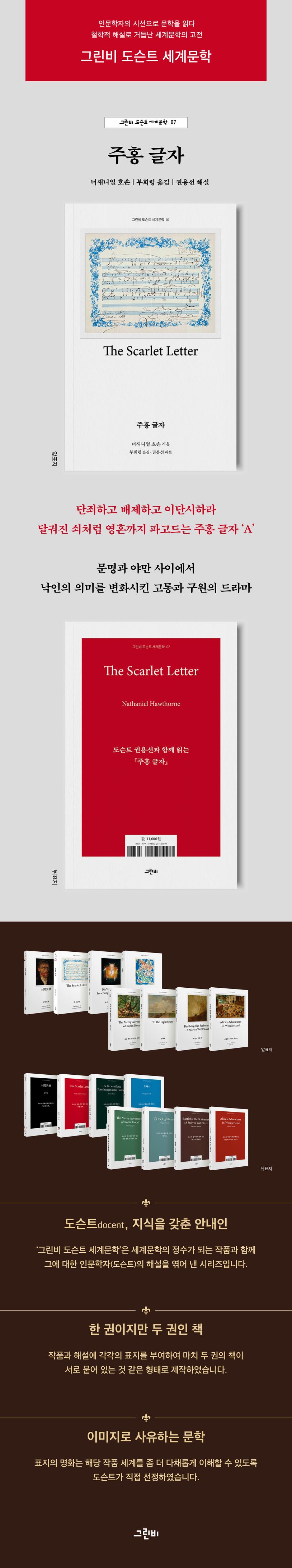 〈그린비 도슨트 세계문학〉 일곱 번째 권으로 출간된 너새니얼 호손의 『주홍 글자』에서 도슨트 권용선은 잘못된 사랑의 결과로 가슴에 주홍 글자 ‘A’를 달고 살아야 했던 한 여성의 삶을 알레고리적으로 해석한다. 17세기 청교도 사회의 엄격한 도덕률과 여성 억압적인 사회 분위기 속에서 간통의 낙인을 강인함과 숭고함의 상징으로 변화시켜 간 헤스터 프린이란 여성을 통해 계몽주의 시대의 사회적 변화와 그로 인한 다양한 갈등 양상을 읽어 낼 수 있다. 문명과 야만 사이에서 드러난 봉인되지 않는 ‘A’의 세계는 다른 방식의 삶을 추구하는 이들에게, 즉 차별과 혐오 없는 세상을 바라는 이들에게 새로운 희망과 기대로 다가올 것이다.