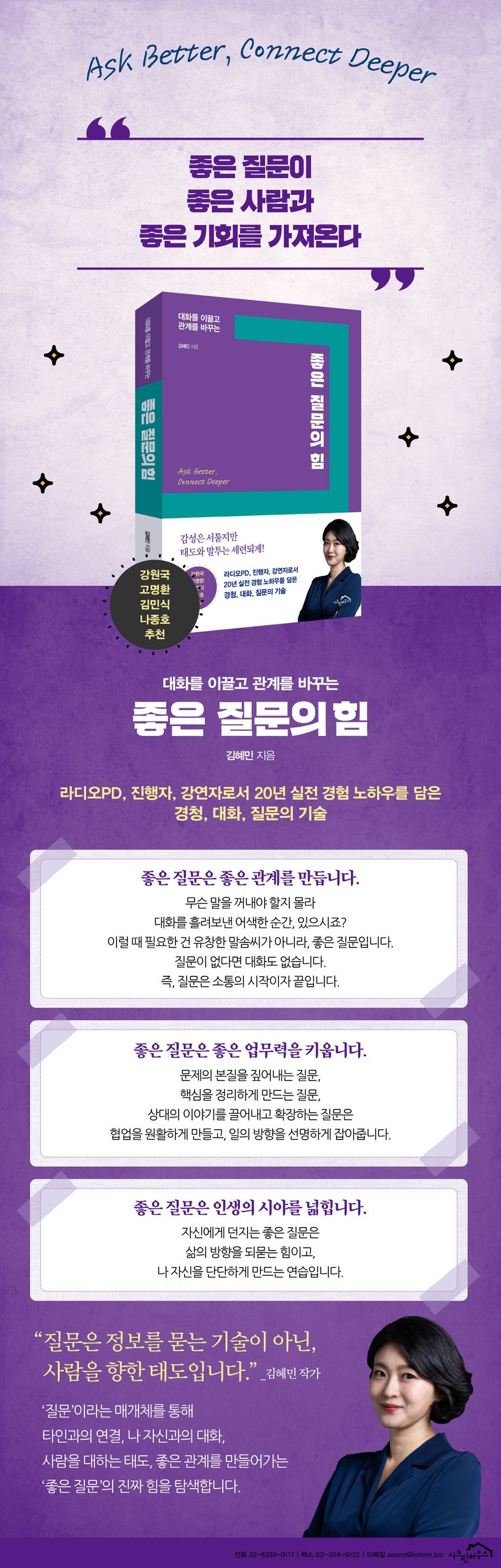 특히상사에게어떻게말문을열어야할지고민하는신입사원,회의자리에서눈치만보게되는직장인,팀원들과의관계에서적당한거리감에어려움을느끼는관리자라면저자가말하는‘좋은질문’의기술을통해지금보다훨씬나은대화를이끌수있다.질문은단순히정보를묻는도구가아니라,관계를연결하고성장을유도하는커뮤니케이션의핵심이다.말을잘하는것보다,적절한질문하나를던질줄아는사람이결국조직안에서신뢰받고,더멀리나아간다.일과인간관계,성과와커뮤니케이션에답을찾고있다면,질문하는태도부터바꾸어야한다.그러나저자는질문의힘을단순히성과나결과의도구로만여기는것은아니다.그보다는질문을통해상대에게다가가고,마음을얻고,나자신도더깊이이해하게되는여정을따라간다.‘경청’에서‘역지사지’,그리고‘연결’로이어지는김혜민작가의질문구조는업무역량,리더십,조직문화는물론,인간관계의모든장면에서유효하게작동할것이다.