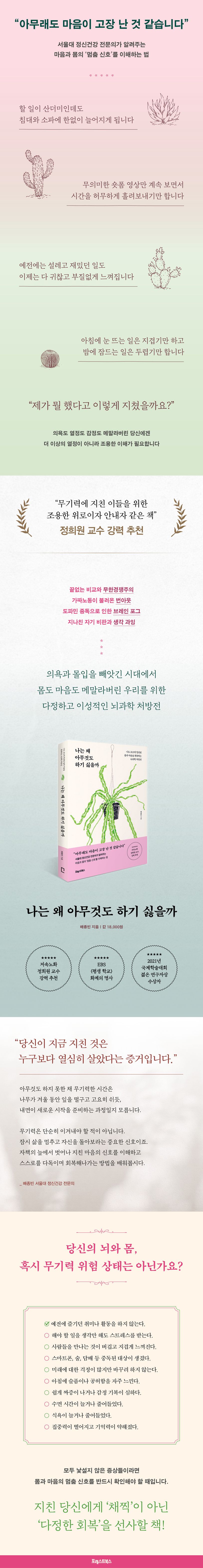 무기력은 단순히 이겨내야 할 적이 아닌 우리의 몸과 마음이 보내는 중요한 신호이다. 무기력에 빠졌을 때 섣불리 새로운 목표를 설정하고 의지를 불태우는 일은 오히려 또 다른 실패와 자책만 낳을 뿐이다. 무기력에 빠진 이들에게 가장 중요한 일은 내 몸과 뇌를 차분히 이해하고 제대로 관리하는 것이다. 내 몸이 보내는 신호를 읽고, 더 나은 삶을 위한 현실적인 해결책을 찾아보자. 이 책을 읽고 나면 무기력을 이해하고 다스릴 수 있는 자신감과 도구를 갖게 될 것이다.