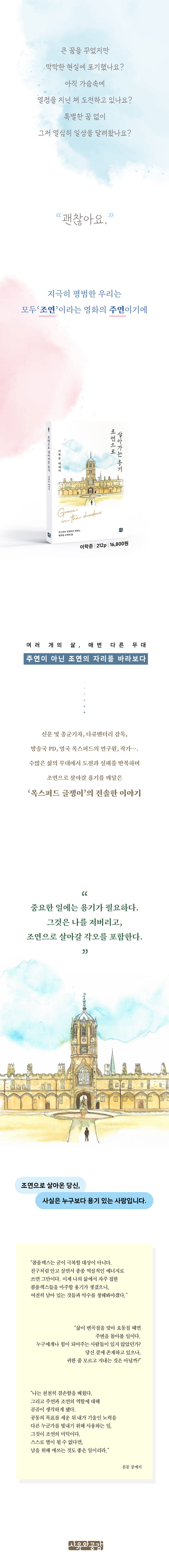 좋은 대학, 좋은 직장, 내 집 마련, 성공적인 결혼…. 우리는 사회에서 말하는 부와 명성을 바라보며 그것을 쟁취하기 위해 하루하루를 버텨낸다. 그러나 최고의 자리에 오르지 못한다면 그것은 반드시 실패한 인생일까? 《조연으로 살아가는 용기》는 비록 세상의 기준에서 주연이 아닐지라도 꿈꾸기를 포기하지 않고 자신을 믿으며 묵묵히 도전해 나가는 삶을 보여주는 따뜻하고 대담한 에세이다.