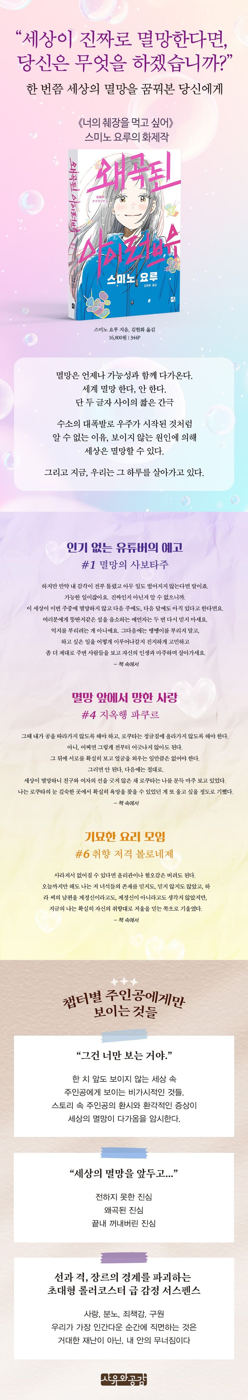 세상이멸망한다니,이보다더좋을수없다!멸망을예고한유튜버와그예언을믿는사람들고교시절웹사이트에올린전설의데뷔작《너의췌장을먹고싶어》가영화화되며일약베스트셀러작가의반열에오른스미노요루의최신작.그동안한국독자들에게공감과위로를끌어내며,팬층을쌓아온그가이번에초대형롤러코스터엔터테인먼트의개막을알리며폭주를선언했다.유튜버가생방송으로예고한‘세계멸망’.어느날갑자기날아든이예언을받아들이고적극적으로행동에나선사람들.그들은멸망이라는예고된죽음앞에서저마다의이유로감춰왔던감정을폭발하고,그것은이내멈출수없는행동으로이어지게된다.주인공들은서로다른삶에서최후의행동을하는데,작가는절대적상황에서사람들의감정변화와선택에주목하며이야기를풀어나간다.전하지못한사랑을고백하는대학생,착한아이가면을벗어던진여고생,악마의얼굴을한선생님,조용히볼로네제를만드는직장인,그리고괴상한생명체와대화하며방송을이어가는코너룬까지.멸망이라는예고된죽음앞에서드러난이들의진심은다양하다.그리고솔직하다.그리고이책은그진심을‘왜곡된사랑’이라고표현한다.과연멸망을앞두고비로소그들이드러낸진심은무엇일까?멸망의사보타주유튜버‘코너룬’은세상이곧멸망한다고,생방송으로선포한다.시청자는몇명남지않았지만,그녀는직접조립한배모형을배경으로기묘한생명체와의소통을시도한다.인상파적애티튜드〈델타〉를부른뮤지션은나스고유키라는팬에게팬레터를받는다.그는나스를기억한다.나스는그에게자주편지를보내주고있기때문.그편지에는나스가보는‘왼팔에꽂힌주사기’에대해적혀있다.그리고세상이곧멸망하게될것이라고말하는데?.일반용메시지‘세상을구하는작전’에뛰어든세키마치소타로올리버는최후의일지를쓴다.그가작전에뛰어든이유는가족을위해마지막이라도무언가를해보겠다는이타적욕망이다.아공간(?空間)에오래머문그는최후의메시지에서재회한‘그들’에대해이야기한다.