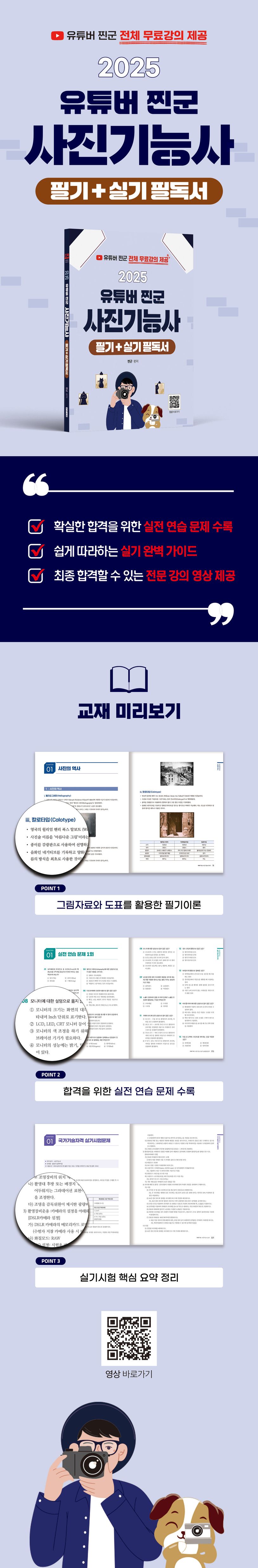 머리말이교재는사진기능사시험준비에필요한모든핵심내용을체계적으로정리하였으며,파트별로중요한문제와해설을담아이론공부를효과적으로할수있도록구성하였습니다.또한,실전연습문제를통해실제시험과같은환경에서연습할수있도록하여학습한내용을확실히다질수있도록했습니다.또한실기내용은기존교재의부족한부분을철저히보강하여실전에서꼭필요한준비과정을담았습니다.
