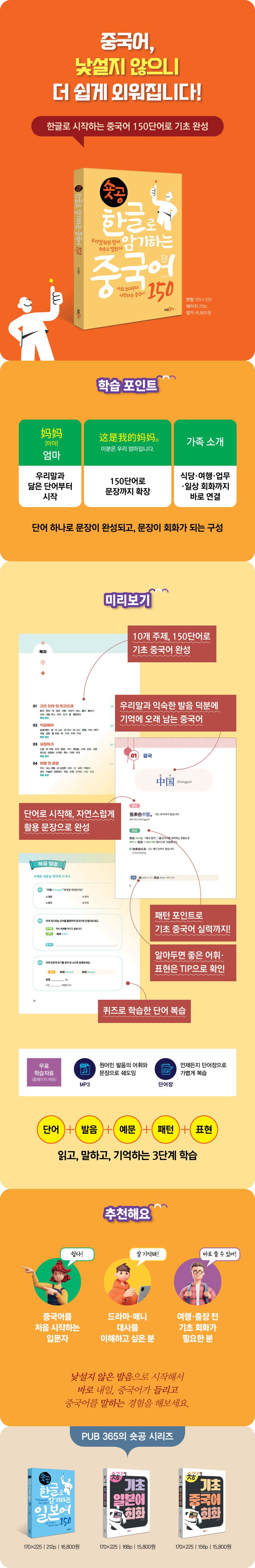이 책은 10개의 주제, 총 150개의 단어의 짧은 학습 분량으로 중국어를 부담 없이 익히게 도와줍니다. 단어만 외우고 끝나는 게 아니라, 실제 문장에서 어떻게 쓰이는지도 확인할 수 있어 바로 회화에 연결됩니다. 또한 한글 발음 표기를 함께 제공하기 때문에 발음에 대한 부담도 크게 덜어 주었습니다.