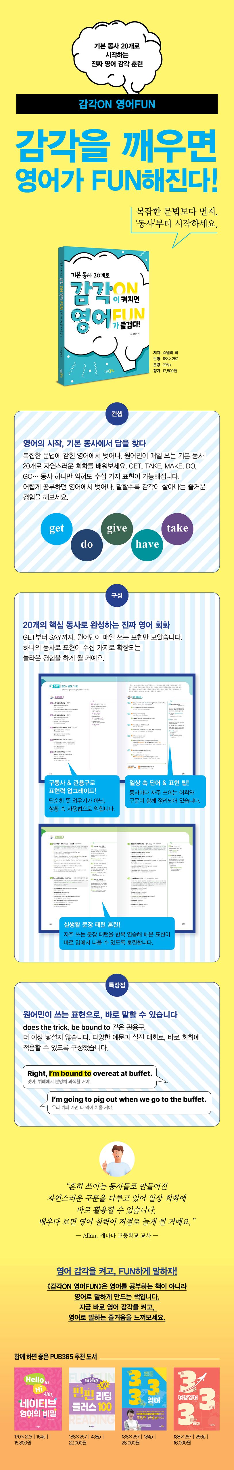 영어 회화의 핵심은 복잡한 문법이 아니라, 일상에서 가장 자주 쓰이는 기본 동사입니다. 《감각ON 영어FUN》은 GET, TAKE, MAKE, DO 등 영어의 기초이자 원어민이 매일 활용하는 핵심 동사 20개를 중심으로, 구동사와 관용구까지 아우르며 자연스러운 표현력을 키워 주는 책입니다.