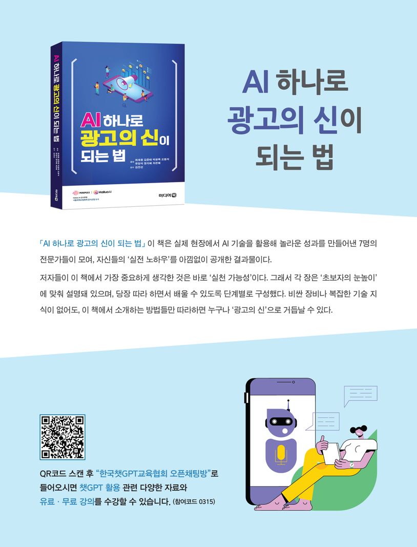「AI 하나로 광고의 신이 되는 법」 이 책은 실제 현장에서 AI 기술을 활용해 놀라운 성과를 만들어낸 7명의 전문가들이 모여, 자신들의 ‘실전 노하우’를 아낌없이 공개한 결과물이다.