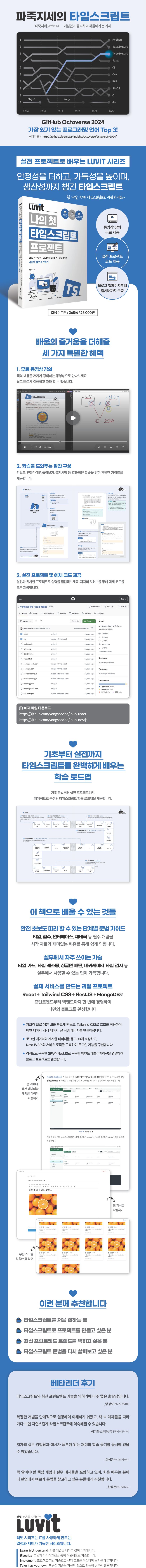 실습 프로젝트로 익히는 타입스크립트타입스크립트는 자바스크립트의 슈퍼셋 언어로, 웹 개발 및 대규모 프로젝트에서 널리 채택되고 있다. 이 책은 타입스크립트의 기본 개념부터 핵심 문법, 고급 기능까지 살펴보고, 나만의 블로그를 만드는 실습 프로젝트를 통해 깊이 있게 학습할 수 있도록 구성되었다. 프로젝트는 리액트 컴포넌트로 웹페이지를 구축하고, Tailwind CSS를 사용해 CSS를 적용하고, NestJS 서버를 구축하고, 몽고DB에 데이터를 저장하고, 마지막에는 리액트와 NestJS를 연결하여 웹 앱 개발의 전체 과정을 경험해볼 수 있도록 구성했다. 빠르게 타입스크립트를 시작하고 최신 프런트엔드 개발을 익혀보자.