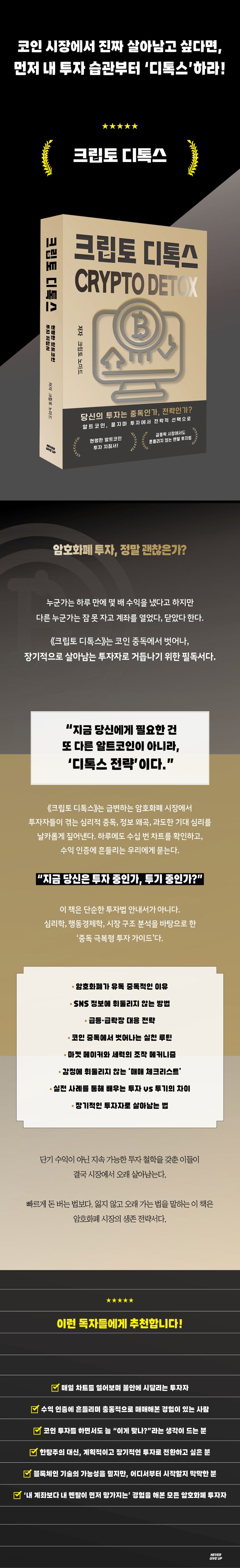 하루에도 몇 번씩 요동치는 코인 시세, SNS에서 끊임없이 쏟아지는 수익 인증, 그리고 그 뒤에 감춰진 계좌의 몰락. 《크립토 디톡스》는 이러한 암호화폐 시장의 실상을 직시하며, 단기 수익에 매몰된 투자자들이 놓치기 쉬운 심리적 함정과 정보의 비대칭, 시장 구조의 왜곡 등을 깊이 있게 분석한다.
