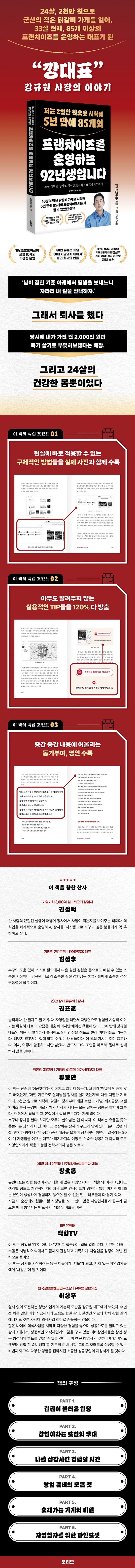 장사를 하지 않더라도, 자신의 길을 고민하는 사람, 무언가에 도전하고 싶지만 막연한 두려움에 머뭇거리는 사람이라면 이 책을 통해 용기라는 장비를 장착하고, 스스로의 삶을 설계하고 도전할 수 있을 것입니다.