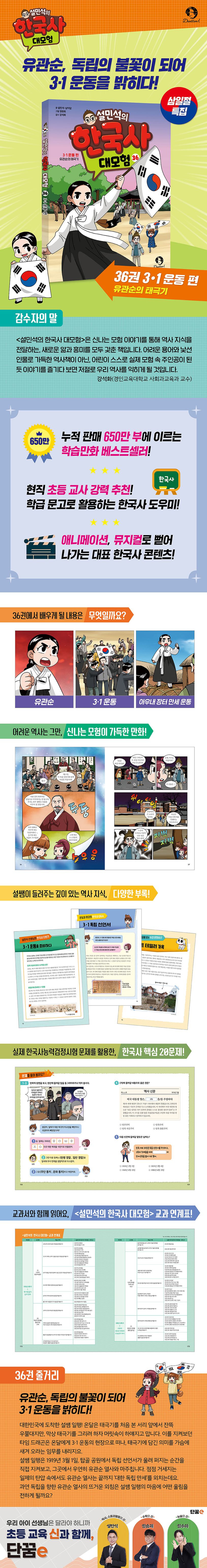 〈설민석의 한국사 대모험〉 36권은 3·1 운동의 현장에서 뜨겁게 독립을 외쳤던 유관순 열사의 이야기를 담고 있습니다. 일제의 탄압과 감시를 피해 한마음으로 3·1 운동을 준비했던 민중들, 그리고 열여덟 살의 나이로 아우내 장터의 만세 물결을 이끌었던 유관순 열사의 역사까지! 일제에 맞서 싸운 3·1 운동의 의미와 그날의 감동을 더욱 생생하게 만나 보세요.