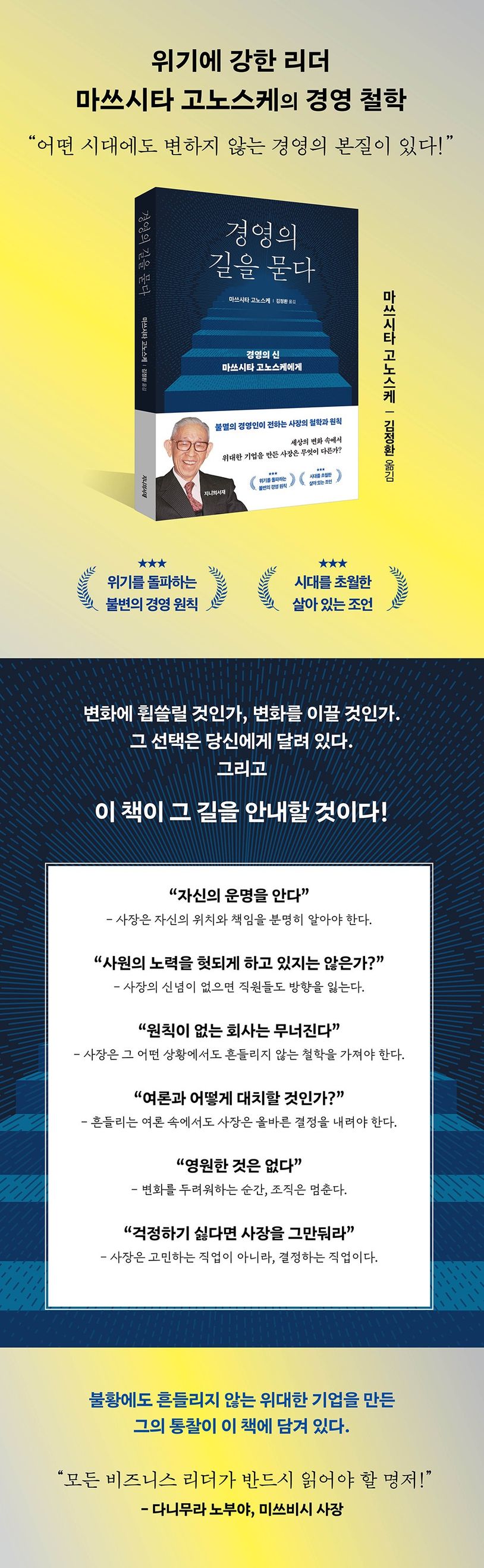 일본의 대표적인 경영자이자 ‘경영의 신’으로 불리는 마쓰시타 고노스케. 그가 남긴 말과 경영 철학은 시대를 뛰어넘어 여전히 전 세계 기업가들에게 깊은 울림을 준다. 그의 철학을 한 권에 담은 이 책은 경영자의 길을 걷고 있는 사람들에게 단순한 조언이 아니라 실제로 시대의 변화와 위기를 돌파해 온 한 기업인의 생생한 지혜를 전달한다.