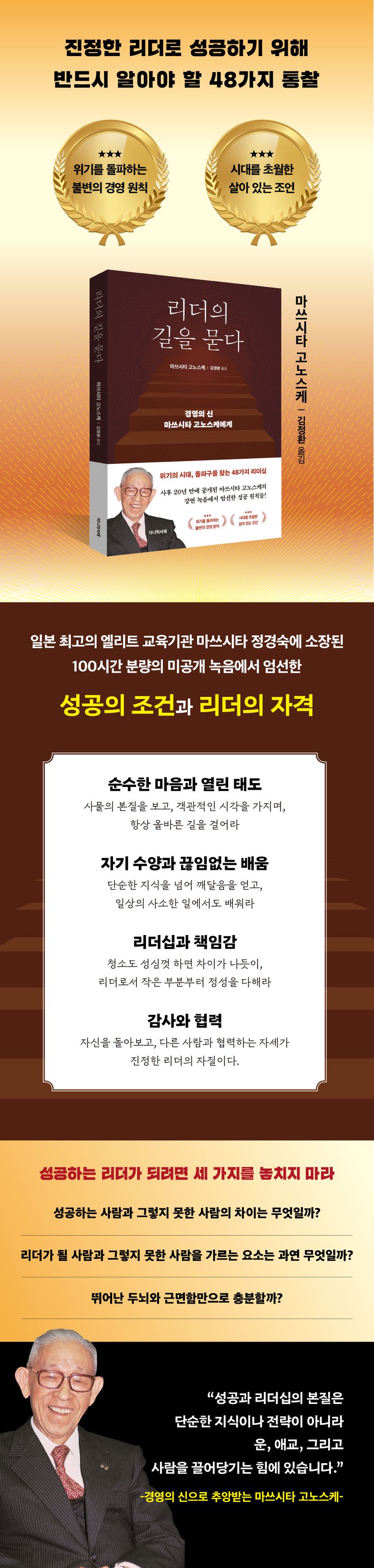 마쓰시타는 가난한 농부의 아들로 태어나 초등학교도 제대로 마치지 못했지만, 자신의 강인한 의지와 현명한 인생철학으로 세계적인 기업가로 성장했다. 그의 성공과 리더십 철학은 책 속에나 있는 허황한 이론이 아니라 실제 현장에서 검증된 지혜의 결정체다. 이 책은 그가 평생 몸으로 체득한 깨달음의 핵심을 담고 있어, 오늘날 리더의 길을 걷고자 하는 모든 이에게 필수적인 지침이 되어줄 것이다.