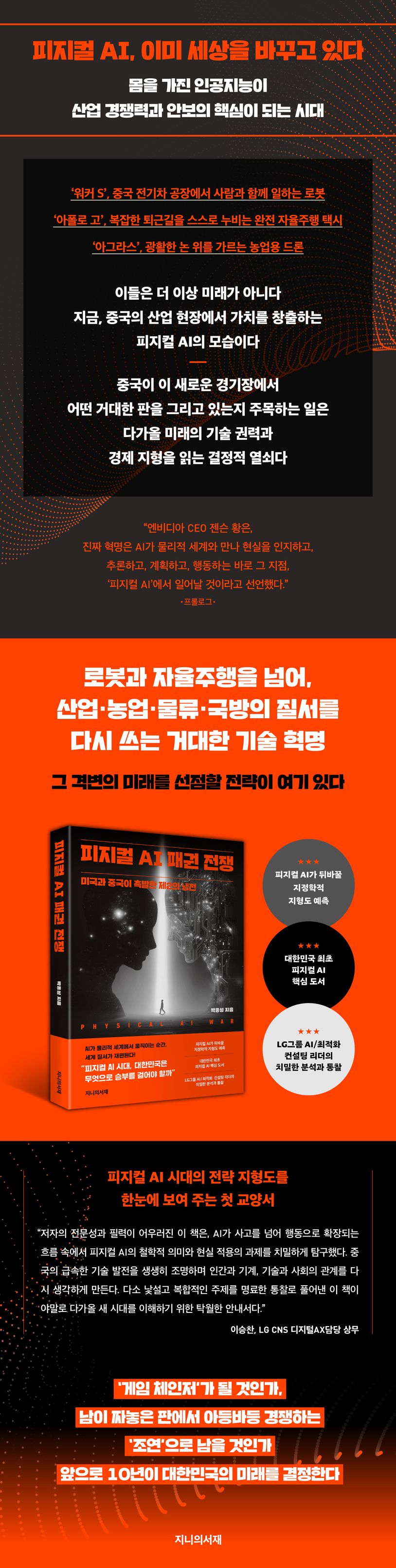 LG CNS에서 15년 넘게 AI 분야를 이끌어 온 현장 전문가 박종성의 『피지컬 AI 패권 전쟁』은, 우리가 스크린 속 ‘AI의 지능’에 매혹된 사이, 스크린 밖 현실 세계에서는 AI에 ‘신체(Body)’를 부여하려는 훨씬 거대하고 전략적인 전쟁이 이미 벌어지고 있다고 말한다. 그리고 그 전쟁의 승자가 21세기의 지정학적·산업적 패권을 결정할 것이라고 단언한다.