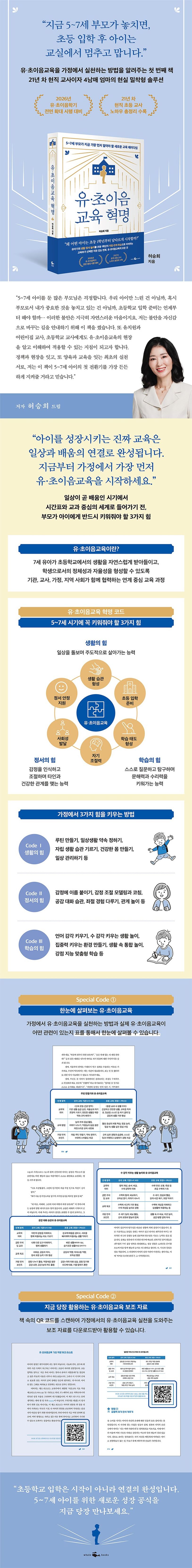 2026년부터 전국적으로 전면 확대 시행되는 ‘유·초이음학기’. 이제 부모와 교사가 함께 힘을 모아 유아 교육 기관(유치원, 어린이집)에서 초등학교로 이어지는 아이의 커다란 전환기를 어떻게 효과적으로 연결하느냐가 양육적으로, 교육적으로 동시에 중요한 이슈로 급부상하고 있다. 《유·초이음교육 혁명》은 단순한 초등 입학 준비서를 넘어 부모와 아이의 불안과 긴장을 근본에서 해결해주는 책으로, 유·초이음 시기라는 거대한 변화를 가정에서 가장 먼저 알고 실천할 수 있는 양육 및 교육 방법으로 구체화한 최초의 안내서다. 저자는 21년 차 초등 교사이자 4남매를 키운 부모로서, 그동안 직접 아이 넷을 키우고 수많은 아이들을 가르치면서 아이들이 유·초이음 시기에 겪는 긴장과 혼란을 누구보다 가까이에서 지켜봤다. 유·초이음학기 시행을 눈앞에 둔 지금, 저자가 오랜 경험을 통해 내린 결론은 분명하다. 유아 교육 기관에서 초등학교로 이어지는 시기, 즉 5~7세에서 초등 1학년으로 향하는 가장 현명한 방법은 두 시기의 체계적인 ‘연결’에서 시작된다는 것이다.