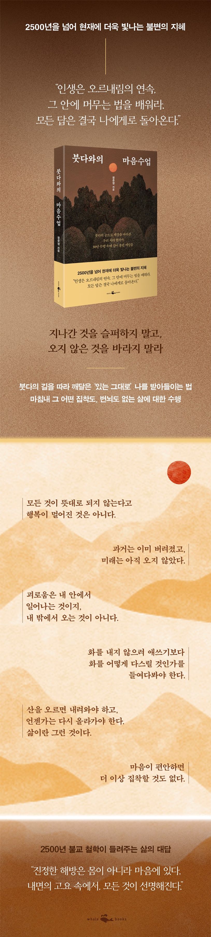 끊임없이 변하는 세상 속에서 자신을 조절하고 중심을 잡을 때 그리고 그 중심에서 깊어진 마음으로 세상을 바라볼 때, 삶은 단단해지고 고통은 지혜로 바뀔 수 있다. 《붓다와의 마음수업》은 모든 것이 빠르고 가벼워진 시대, 불안과 성냄이 소용돌이치는 세상 속에서 우리를 내면의 고요로 이끈다. 무언가를 애써 붙잡지 않아도 흔들리지 않는 마음, 그것이 바로 깊어지는 삶의 시작이다.